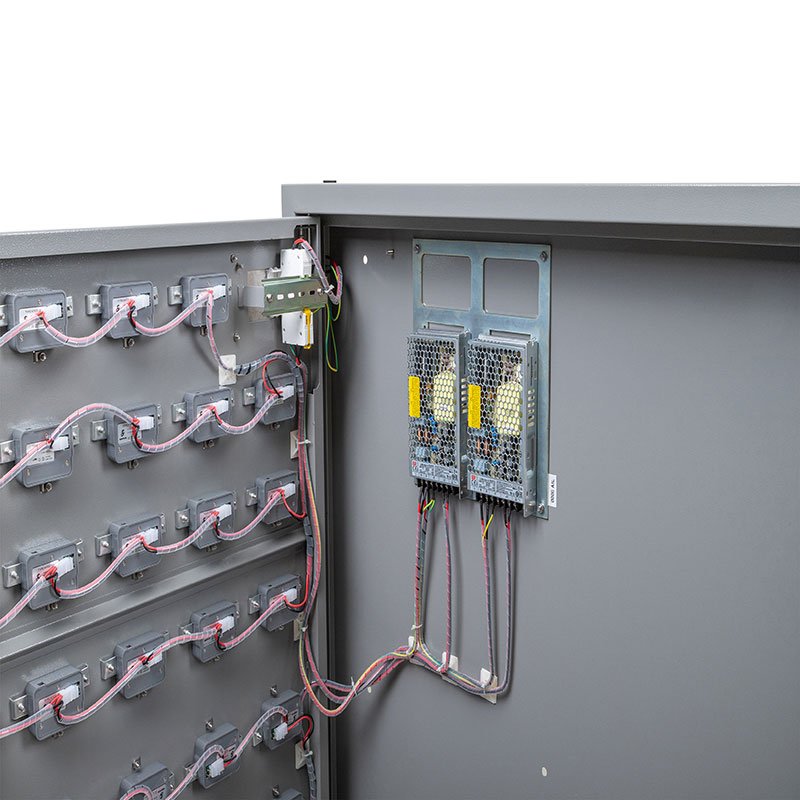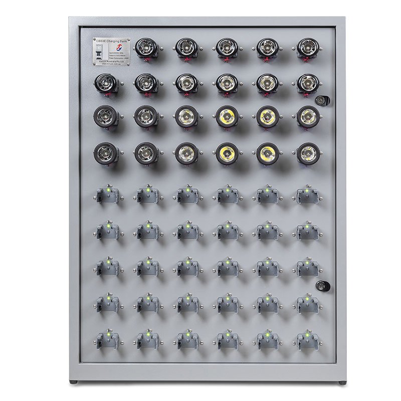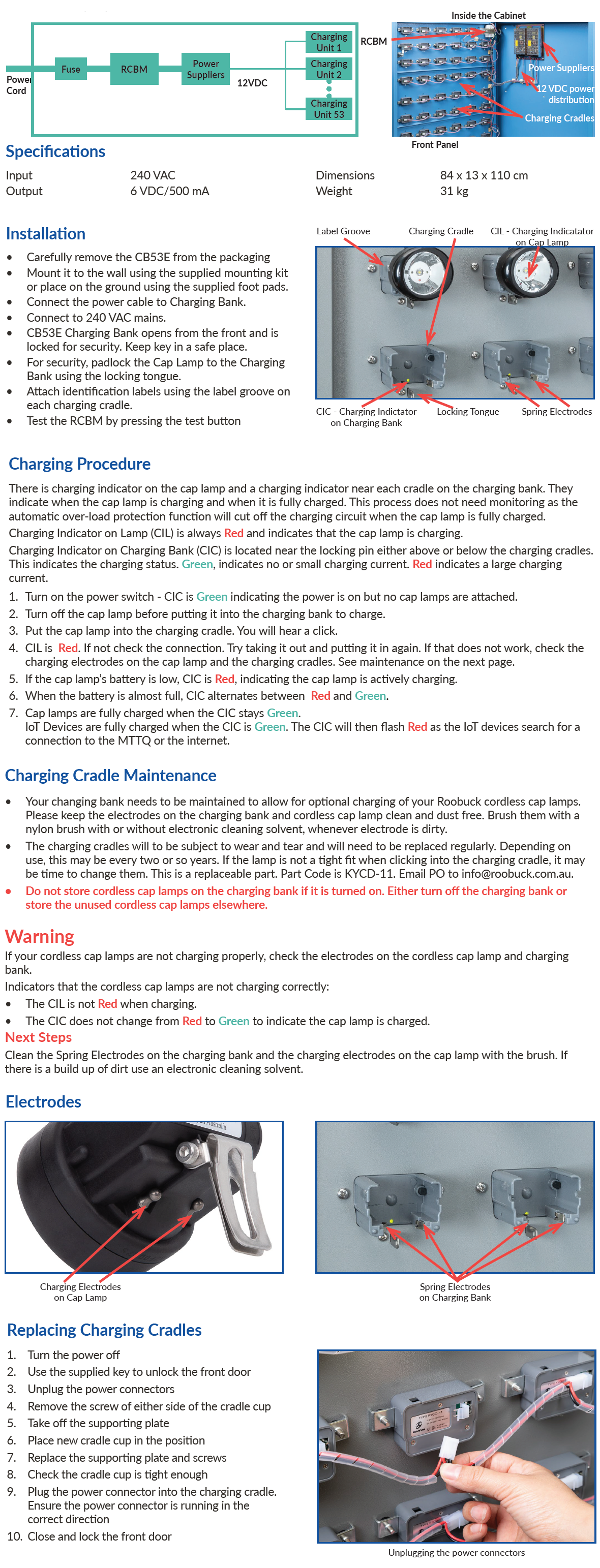 Roobuck CB53E Charging Banks are wall mounting charging facilities to charge up to 53 Roobuck E & U models cordless cap lamps. There is charging indicator on the cap lamp and a charging indicator near each cradle on the charging bank. They indicate when the cap lamp is charging and when it is fully charged. This process doesn’t need monitoring as the automatic over-load protection function will cut off the charging circuit when the cap lamp is fully charged.