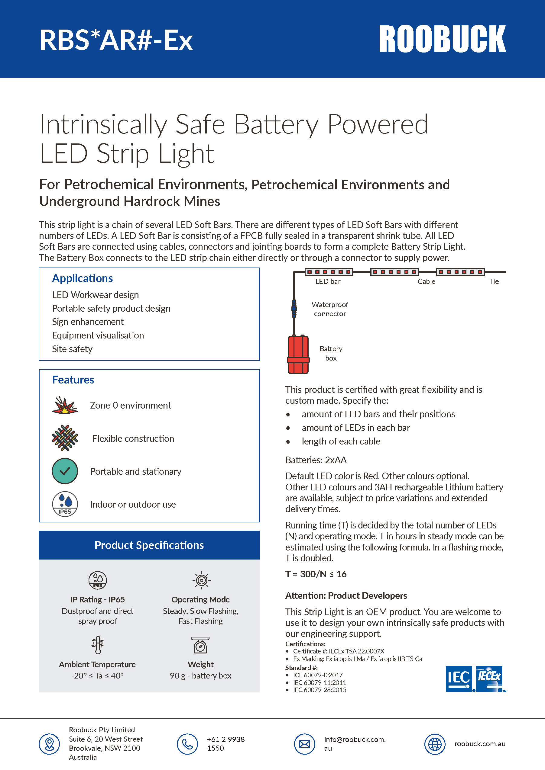 The RBS*AR#-Ex is an Intrinsically Safe Battery Powered LED Strip Light. It is a chain of several LED Soft Bars. There are different types of LED Soft Bars with different numbers of LEDs. A LED Soft Bar is consisting of a FPCB fully sealed in a transparent shrink tube. All LED Soft Bars are connected using cables, connectors and jointing boards to form a complete Battery Strip Light. It is powered by 2 x AA batteries. The Battery Box connects to the LED strip chain either directly or through a connector to supply power.
