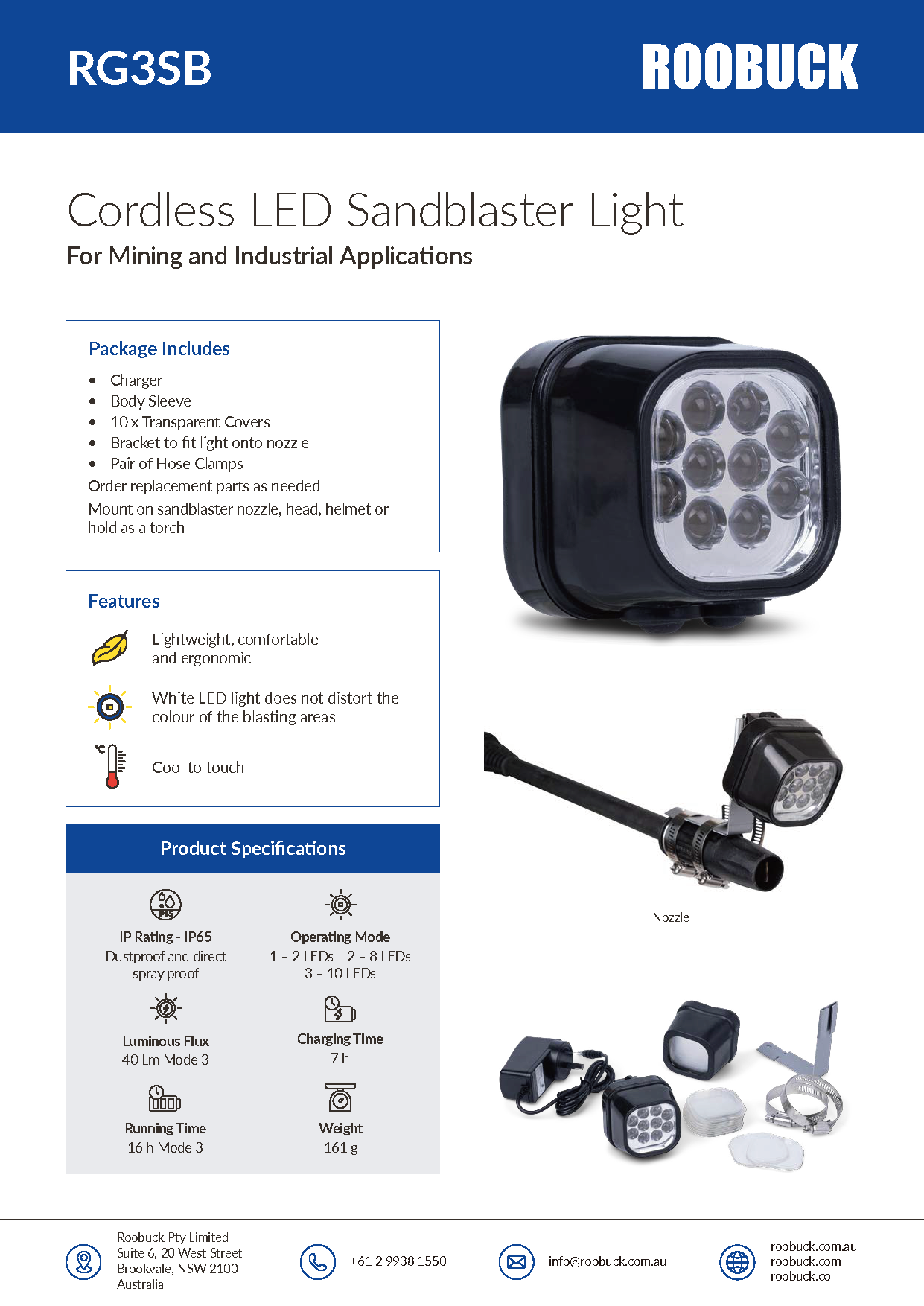The Roobuck RG3SB Cordless LED Sandblaster Light is designed to mount onto a sandblaster nozzle. It is powered by a Lithium rechargeable battery.