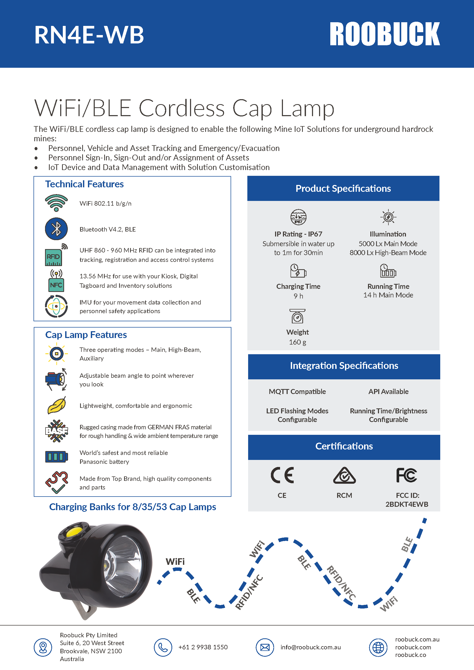 Roobuck’s WiFi/BLE cordless cap lamps integrate into the following Mine IoT Solutions for use in underground and open cut mines: